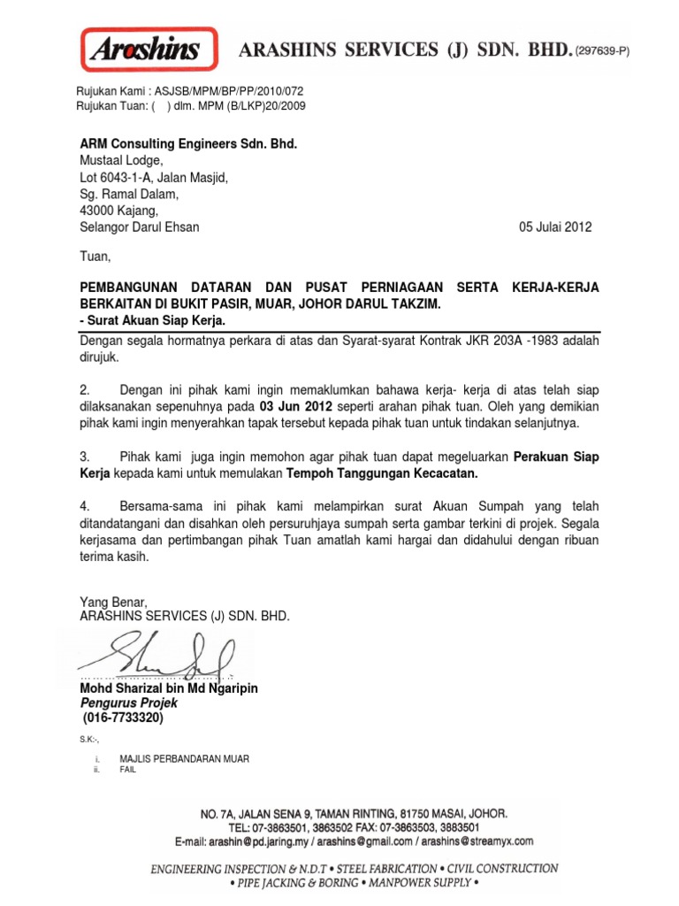 Contoh surat akuan siap kerja k p 850403 11 5453 pengurus ciptaan hilir enterprise beralamat 2875 a kg baroh banggol. 183 Perakuan Kerja Tak Siap Muka surat 1 81 Kerajaan - masukkan KERAJAAN MALAYSIA bagi Projek Persekutuan dan KERAJAAN NEGERI bagi Projek Negeri. 1- Tempoh Liabiliti Kecacatan DLP bermula iaitu selama 1 tahun untuk kontrak konvensional dan selama 2 tahun untuk kontrak secara design and build.